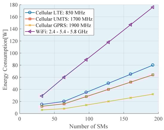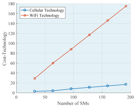 Figure 7 shows the energy consumption in watts that each wireless technology would have when considered in the deployment, and the average consumption is detailed in Table 4. The reference values of consumption in each wireless technology were taken from []. Additionally, Table 5 shows the growth of each wireless technology (WiFi) and the chargeability. It should be noted that the cost of the cellular technology has an important difference in relation to the WiFi technology. At first, the model may consider all SMs as candidates to connect directly through cellular technology, but this would represent a high cost. To improve such cost, the model increased the SMs connecting through WiFi technology while decreasing the number of SMs connecting directly through cellular technology; in this way, the cost for the use of the resources, in particular in terms of energy consumption, was reduced.