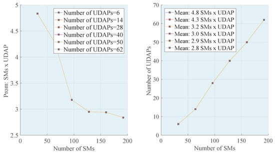 Figure 8 shows the average number of SM that were connected to another SM taking the role of UDAP. Similarly, it shows the number of UDAPs implemented in each population of SM. In Table 6, we show the variation in % and the amount of the flow of the link in terms of both usage and occupation. This way, we could verify the changes between each SM population and the average of the flows on the links.