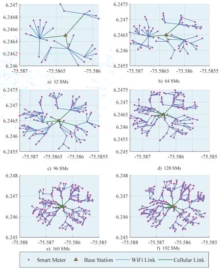 Figure 10 shows the deployment of the heterogeneous wireless networks for different population sizes: (a) 32 SMs; (b) 64 SMs; (c) 96 SMs; (d) 128 SMs; (e) 160 SMs; and (f) 192 SMs. The scenarios were georeferenced, and all provided a 100% coverage.