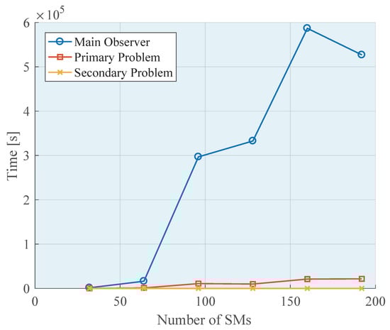 The efficiency and performance of the model is presented in Figure 11. We illustrate the growth in the CPU time required for each SM population. The model formed by a main observer enclosed the global time of the model, while the primary problem for the generation of columns had a different time; additionally, the time of the secondary problem in charge of modifying the topology had a constant time due to its minimum incidence in the total time used for each population of SM. One can observe the time of the primary problem and the secondary problem in relation to the main observer, which entailed a longer time, since it contained the intelligence of the heuristic process. The calculation time of the CMCF-AMI based on the column generation algorithm as the population increased was reduced by 10%, and this was the expected return when the population was considerable. The result was evident when the population grew from 160 to 192 smart meters.