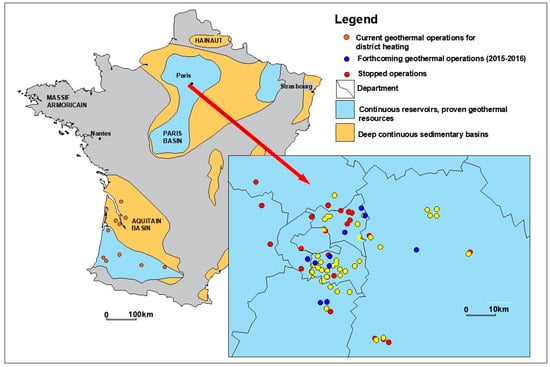 The map of locations of deep geothermal operations (for district heating) within two main sedimentary basins in France (zoom in Ile-de-France) based on [45].