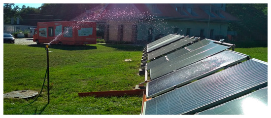 The main aim of the research was to reduce the temperature of the photovoltaic modules during the generation of electricity, as this was supposed to lead to an increase in the power of the solar generators. To reduce the temperature of the device, it was decided to use cold tap water, which is a good way of cooling photovoltaic modules [16,17,18,19,20]. The water used in cooling the PV modules was taken from a regular water supply network, as the investigation was unable to secure a closed circuit source. At the beginning of the experiment, the cooling water that flowed over the surface of the module was captured in a 1.5 L container as run off in order to estimate the water flow, which is equal about 0.11 L/s. This water flow was maintained as a constant throughout the tests. As a result, to cool the PV module, almost 400 L per hour were used. Further tests are required to establish the efficiency of a system when PV modules are cooled by water in a closed circuit.
