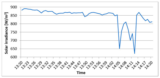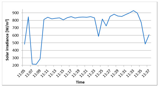 In the next step, research was conducted to achieve the maximum effect of PV cooling. To cool the PV module, the water film method was chosen. The test was made by continuously pouring water over the PV module. The ambient temperature was 32 °C, and wind conditions were stable. The average wind speed was 0.3 m/s, and at one point, the maximal wind speed was 3.7 m/s. The relative air humidity was 74.5% [21]. The test was run for one hour. During the first 45 min of research, weather conditions were favorable, but by the end of the test, slight cloud cover was observed. During the experiment, solar irradiance fluctuated between 800 W/m2 and 900 W/m2, and for a moment, it fell to the level of 700 W/m2. The changes in solar radiation during the maximum power test are shown in Figure 10.