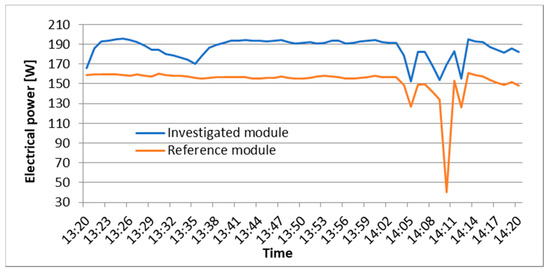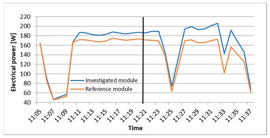 The graph shown in Figure 6 clearly confirms the influence of cloud cover. However, once the solar conditions stabilize, the effect of cooling starts to be noticeable and has a clear influence on the improvement of the tested module’s power compared with the power of the reference module. The use of rain imitation in these atmospheric conditions meant that 15 W of extra power was obtained in the cooled device. The attached chart shows the time from 11:05:39 to 11:21:30, when the investigated module was cooled by rain imitation. Then, the cooling system changed and water in the form of a water film started to flow as shown in the chart from11:21:30 to 11:37:09. The cooling effect is immediately noticeable. In the graph (Figure 6), the power lines of both devices clearly start to diverge. Then, momentary cloudiness causes the power of the solar generators to fall by almost the same value, but when favorable conditions returned, the excess power in the cooled module gradually increased. It ranges from 20 W at the beginning of the water film to over 30 W at its peak.