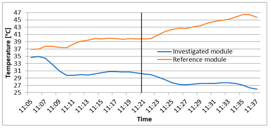 Temperatures of investigated and reference modules during the comparative 30-min test.