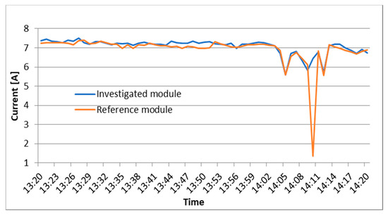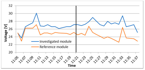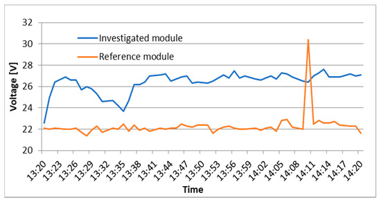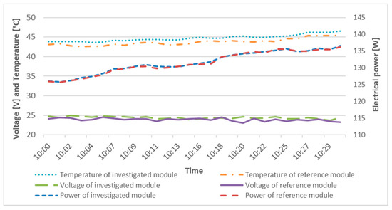 During the maximal power test, the voltage and current of both PV modules were measured. Both modules had the same temperature coefficient: the temperature coefficient of the open circuit voltage (Voc) is −0.334%/K and the temperature coefficient of the short-circuit current (Isc) is +0.069%/K. The voltage of the reference module was stable and approximately 22 V. When the investigated module was cooled, its voltage was at the level of 27 V, or 5 V higher. The voltage and current peak observed at 14:11 was caused by the momentary shading of the reference PV module. In this situation, the voltage of the shaded module increased considerably [22,23]. The current of the investigated PV module was almost the same as that of the reference PV module, apart from when a technical problem occurred (at 14:10, when the reference module was shaded by people for a period). The changes of voltage and current curves are shown in Figure 13 and Figure 14.