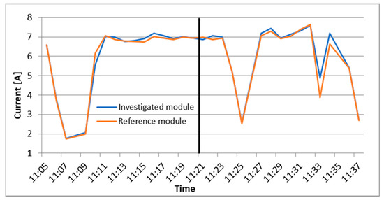 The parameter that directly translates into the power of the device from the physical point of view is electrical voltage, and this was measured at the maximal power point of the PV modules. The graph presented on the diagram in Figure 8 presents changes in the magnitude of voltage in the investigated and reference modules during the two stages of the test. By reducing the temperature of the modules, a higher voltage is generated on the cooled solar generator. In Figure 9, the graph shows changes to the current of both devices during the comparative 30-min tests. It can be seen that both lines are almost the same, and this confirms that the change of PV module temperature has little effect on the current.