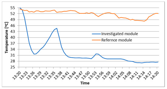 During the maximal power test, the temperature of both PV modules were measured. The average temperature of water using to cool PV modules during this test was 20.7 °C. It allowed us to determine the maximum temperature difference between both devices. The temperature of the investigated module decreased to almost 32 °C and, by the end of the test, even to 28 °C. At the same time, the reference module had a temperature of above 50 °C. When the technical problem occurred, the temperature of the investigated module rose quickly. During the test, the temperature difference between both devices was stable at the level of almost 24 °C. All changes in temperatures can be seen in Figure 12.
