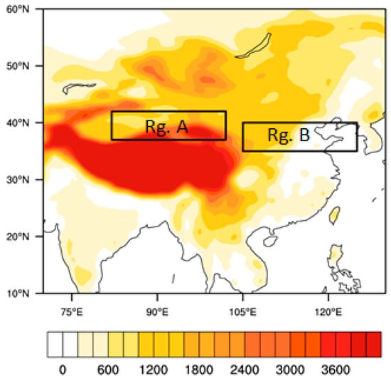 Details of study area domain and locations of the two regions (i.e., Rg. A and Rg. B) in China. The shading indicates terrain elevation in meters while the boxes show the longitudinal and latitudinal extents of the selected regions.