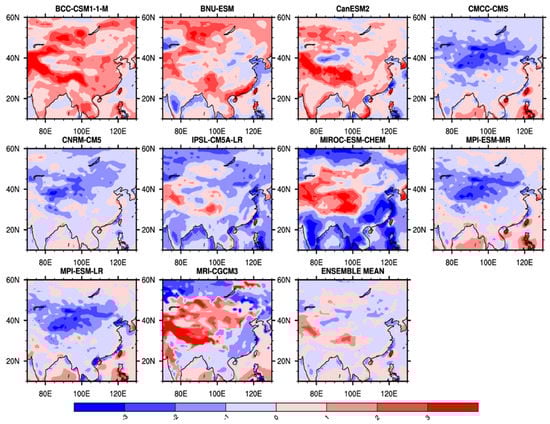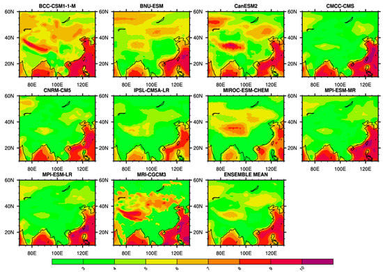 All the models showed higher mean wind speeds over the coastal areas as expected for offshore wind speeds albeit with varying magnitudes. MPI-ESM-LR, MPI-ESM-MR, MRI-CGCM3 and CMCC-CMS had mean wind speeds of about 9–10 m/s at the South China Sea (south-east) of the study domain but lesser around the Bay of Bengal area only about 6–8 m/s with all the four models showing an increasing gradient away from land. Models BCC-CSM1-1-M, CanESM2 and BNU-ESM show wind speeds >6 m/s in the 30°–50° N latitudinal belt, a pattern also replicated in the MRI-CGCM3 model. Overall, mean wind speed was lower in the IPSL-CM5A-LR and MIROC-ESM-CHEM models although the same spatial distribution observed in the earlier discussed models are also present. The ensemble mean model captured the same spatial distribution with a smaller sized area of higher wind speed along the 30°–50° N belt. The patterns for WPD are similar to that of the wind speed (Figure A1 in Appendix A), although most onshore areas show WPD below Class II which is less than 250 W/m2 [10].