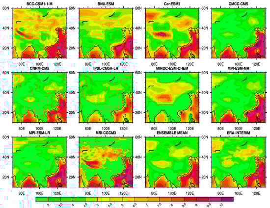 The location agreement for wind speed peaks is relatively higher in the coastal areas of the study domain in the south-east and south-west although there are significant differences in magnitude. For size, all the models also show very high agreement except for the IPSL-CM5A-LR and MIROC-ESM-CHEM which show lesser spatial extents for the coastal areas covering the South China Sea and Bay of Bengal. Over the 30°–50° N belt, however, large differences in size are observed with some models having no wind speed peaks for the entire longitudinal expanse such as MPI-ESM-MR, MPI-ESM-LR, CMCC-CM5, and IPSL-CM5A-LR models. Relative to the reanalysis dataset, BCC-CSM1-1-M, CanESM2, MRI-CGCM3, and BNU-ESM overestimate the mean value, while the ensemble mean appears to moderately underestimate mean values. For the entire study area, BCC-CSM1-1-M, and CanESM2 tended to show higher mean wind speed while MPI-ESM-MR, MPI-ESM-LR lesser magnitudes. The ensemble mean outperforms individual models in capturing the spatial characteristics. Broadly, the mean wind speed ranged from about 8 m/s at the offshore and coastal areas of South China Sea, about 6–7 m/s at the Bay of Bengal region and about 4–5 m/s at most inland areas of the domain.