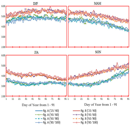 The analysis results as presented in Figure 6 show that mean daily wind speed is higher in December-January-February (DJF) and least in June-July-August (JJA) for both regions (Rg. A and Rg. B) based on a Day of Year timeline. The probable annual cycle shows wind speed reduced from its peak values in winter through to lower values in spring and summer. This is followed by a gradual increase in autumn as the weather transitions to cooler wintertime temperatures. On the temporal scale, the first time slice 2021–2040 recorded the maximum wind speed for both regions and this is repeated for the 4 seasons although with lesser differences in magnitude in summer and autumn seasons. Also noteworthy is that despite the geographical proximity between both regions, wind speed was higher in region B than in region A. Details of the spread of wind speed in m/s for the ensemble mean over each region including the minimum, quartiles, and maximum are contained in Figure A7.
