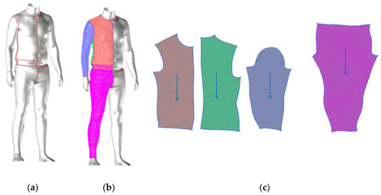 A close-fitted clothing system was selected that is usually worn by sportsmen during running, cycling, etc. This clothing system consists of a close-fitted long sleeve shirt and close-fitted trousers. By use of reverse engineering techniques, the 2D patterns of the clothing system were generated. Also, the software 3D DesignConcept [30] was employed for this purpose. The NURBS model of the test person was imported into this software. The required design was constructed directly on the surface of the model with the help of the integrated drawing tool and the resulting curves are called region curves (Figure 2a). In order to generate the 2D pattern cuts, 3D regions were identified according to the design by region curves and the regions were produced (Figure 2b). A region is an entity that represents an approximation of a partial 3D shape. It consists of a triangular mesh that is limited by one or more boundaries [31]. The 2D pattern cuts were generated automatically by flattening (Figure 2c). The flattened regions are called patterns.