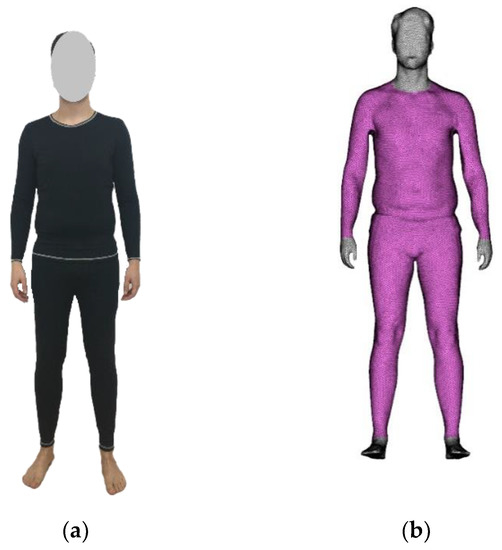 A test person, who volunteered to take part in this study, was selected for performing the thermophysiological simulation and wear trials. The test person is a student, who actively participates in sports like jogging, cycling, and running. He is 28 years old, was medically examined and declared healthy, weighs 83.4 kg and is 183.5 cm tall. In order to execute the simulations, virtual data of the test person was required. Thus, 3D virtual data of the test person was generated by means of 3D scanning using a 3D-body scanner VITUS [27]. As a result of scanning, a point cloud was achieved, which was further used to produce the polygon model by triangulation. It is the fact that scanning of the shaded areas of the body like crotch, armpit do not fulfill the required quality. Therefore, this polygon model was refined and repaired in the software Geomagic Studio [28] so that it can be used for development of close-fitted clothing and thermal simulation. The polygonal model is a facet model, whose surface involves a huge number of planar triangles. Figure 1a shows the polygon model of the test person. The surface reconstruction of the polygon model was carried out to develop the NURBS (Non-uniform rational B-splines) model (Figure 1b), which is defined by combinations of vertices, node vectors, and transition conditions. For body surface modeling, NURBS is an industry-standard tool [29], which is mostly used for parametric representations.
