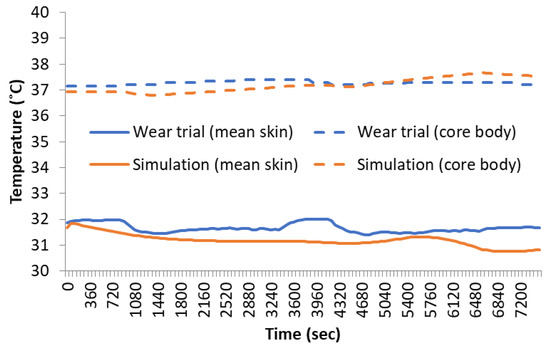 Mean skin and body core temperature during wear trial and simulation.