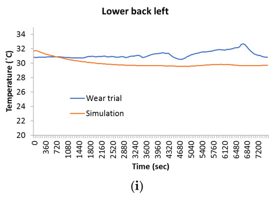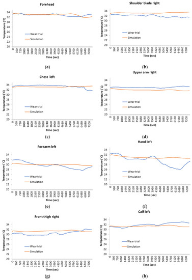 In Figure 7, the local skin temperatures of different body parts of the test person during wear trial and simulation are compared. The majority of simulation results is in good agreement with wear trial results, i.e., the skin temperatures of forehead, chest left, calf left, and front thigh right (Figure 7a,c,g,h) generally show similar trends with only minor variations compared to wear trial results. Nevertheless, some simulation results differ from wear trial results by 1–2 °C, e.g., in the case of the upper arm right, shoulder blade right, and lower back left (Figure 7d,b,i). The skin temperatures of left hand and forearm left during simulation exhibit a trend that is similar to the wear trial but with a significant variation of up to 4 °C and 2.5 °C, respectively (Figure 7e,f). The reason of this significant difference is behavior of skin temperatures, which declines during the second and the fourth phases of wear trials. This decline in skin temperatures is due to the forced convection that occurs on the moving body parts (hands, arms, legs, and feet). Since the thermal simulation cannot be realized the body movement, therefore the simulation results consist of relatively smooth curves compare to the wear trials. Furthermore, skin temperature of left hand shows more variation compared to forearm left during wear trial. This difference is due to the thermal insulation of the fabric layer between forearm skin and the outer environment. In case of left hand, no fabric layer is present.