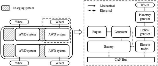 To overcome the limitations of the high-torque electric motor, electric drive technology has been studied for electric all-wheel-drive (AWD) vehicles in which four motors are mounted on the drive shaft [15]. Electric AWD can easily be applied using an electric motor with a small torque capacity. A separate engine can be installed for charging the battery, which minimizes the battery capacity. Therefore, AWD technology can replace a high-power engine with four electric motors, which can continuously perform high-torque operations by charging the battery through the additional engine.