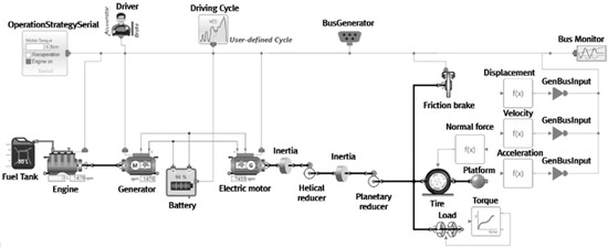 The driving cycle model represents the preset vehicle velocity and vehicle acceleration. Vehicle velocity was calculated based on motor rotational speed and tire diameter, as shown in Equation (6) [34]. The operation strategy serial model operates the generator according to the setting range of the SOC level of the battery. The charging range of the SOC level was set to the condition that the generator is always driven. All models were connected via a bus system, and the models interacted according to input conditions. The time steps of the simulation were set to 35 s and 40 s in the off-road and the on-road condition, respectively, to match the load measurement time during the driving test.