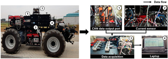 The load measurement system was developed and installed on an electric AWD tractor for measuring real-time data during operation, as shown in Figure 4. The current sensors (LF-1005S, LEM USA Inc., Milwaukee, WI, USA) and CAN logging system were installed to measure current and rotational speed of electric motors and voltage of batteries for calculating axle torque. The current sensors used in this study were installed between each battery and controller of the electric motor, generating a coil magnetic field according to the current flow and recognizing the current generated by the magnetic field detecting of the hall sensor up to 1000 mA. The SOC level was measured using the CAN logging system connected to a battery management system (BMS). A data acquisition device (QuantumX MX840, HBM, Darmstadt, Germany) was installed to acquire and transfer the signals from the current sensors and the CAN logging system to the laptop computer. The accuracy classes of the data acquisition device ranged from 0.05% to 0.1% depending on the sensor technology. Two 24-bit analog input channels with a sampling rate of 300 Hz per channel were used to acquire the current, and four digital input channels with a sampling rate of 300 Hz per channel were used to measure the CAN data. The measured signals were transmitted and saved on the laptop computer through the signal processing program CATMAN (ver. 3.1, HBM, Darmstadt, Germany).