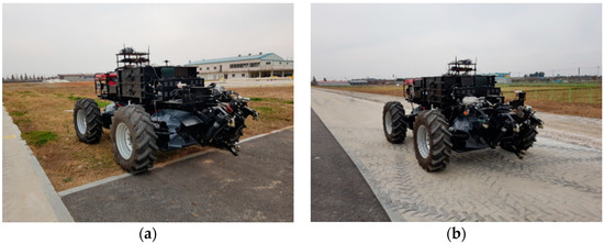 We conducted driving tests to measure data for calculating axle torque on a test track (Latitude: 35°56′08.5″ N, Longitude: 126°55′33.1″ E) in Iksan-si, Jeollabuk-do province, Republic of Korea. Driving tests were conducted at a ground speed of 10 km/h considering the working speed of a tractor, which is the standard used in the tractor design [35] under off-road (field) and on-road (asphalt) conditions, as shown in Figure 5. The driving test was conducted with the generator always running during all operations and the generator’s gasoline fuel tank was filled with 30 L. The driving test was conducted through a wireless controller that controlled the speed of the four motors. The platform traveled approximately 45 m for 25 s in off-road conditions and 80 m for 35 s in on-road conditions at 10 km/h. Data measurement was performed in off-road and on-road conditions for 35 s and 40 s, respectively, and the measurement time included a stop section of about 10 s before and after the driving test.