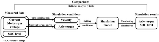 Figure 6 shows the overall test procedure as a flow chart. The current and rotational speed of electric motors and voltage of batteries measured during the test were converted into torque using the current–torque characteristic curve. The current–torque characteristic curve was provided by the motor manufacturer, and the output torque of the motor was calculated according to voltage, motor rotation speed, and current. The calculated torque was converted to axle torque by applying gear ratios of 4.3 and 12.05. The calculated torque and velocity of the vehicle were used as input conditions for the simulation. The measured data and simulation results of the axle torque and SOC level of the battery were compared through simulation, and the similarities between the two results were verified using t-test calculated with IBM SPSS Statistics software (SPSS 25, IBM Corp., Armonk, NY, USA).