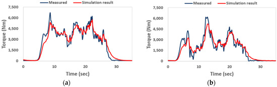 Comparison of averaged tractor axle torque of (a) left and (b) right sides for measured and simulated results at ground speed of 10 km/h in on-road conditions.