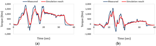Comparison of averaged axle torque of (a) left and (b) right sides of the tractor for measured and simulated results at a ground speed of 10 km/h in off-road conditions.