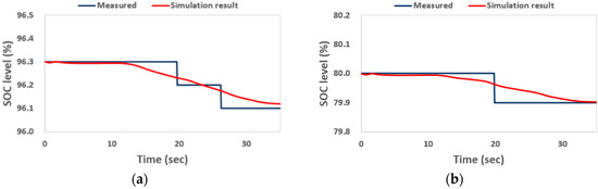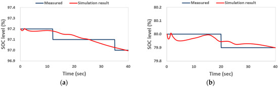 The measured and simulated SOC levels were compared when the vehicle was traveling at 10 km/h. Figure 9 depicts the results in off-road conditions. The initial and final SOC levels of the battery connected to the left motor were measured at 96.30% and 96.10%, respectively, and 80.00% and 79.90% for the right motor, respectively. Simulation analysis showed that the initial and final SOC levels of the battery connected to the left motor were 96.30% and 96.11%, respectively, and 80.00% and 79.90% for the right motor, respectively. The rate of change of the SOC level during operations by driving the left motor for measured and simulated results were about 0.20% and 0.18%, respectively, with a 0.02% difference between results. The rate of change of the SOC level by the right driving motor for measured and simulated results was similar, with a 0.10% difference between results.