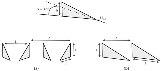 In Figure 1, is the free stream velocity of the oncoming flow, and is the height and the length of the VG in the chord direction. The distance between two devices in the co-rotating and counter-rotating VG configuration is represented by λ and L, respectively, defining the distance between two devices in the trailing edge in the counter-rotating configuration.