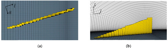 In the current work, the jBAY source term model presented by Jirasek [25] and based on the BAY model developed by Bender et al. [32] was implemented in the commercial CFD code STAR CCM+® [35]. The BAY model was modeled to simulate vane-type vortex generators in finite volume Navier–Stokes codes and allows substituting the VG geometry by a subdomain of similar geometry at the same location. Then, a body force distribution normal to the local flow is applied to simulate the effect of the vane (see Figure 3). The normal force represented by Equation (1) is introduced as in Figure 3b. This normal force simulates the force generated by the VG without having to design and mesh it (see Fernandez-Gamiz et al. [36]). The force for each cell in the VG domain is calculated with Equation (1):