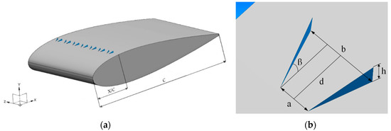 Airfoil equipped with vortex generators (VGs): (a) row of vane-type VGs; (b) detailed view of VG pair with geometric dimensions.