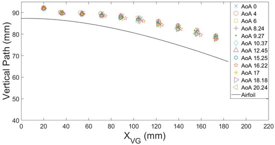 Meanwhile, in the case of a flat plane with VG devices, the vortex vertical path does not change its trajectory and is usually horizontal (see Ibarra-Udaeta et al. [46]). In the case of an airfoil profile, it was concluded that the vortex tends to follow parallel to the wall. This behavior of the vortex was concluded in Errasti et al. [3], where a VG device was set up on a flat plate and before going down a linear ramp. In this study, the vortex tended to continue the bottom wall path going down the ramp. The simulations performed for this purpose in the current work show that the generated vortex axes had similar vertical behavior in the first 20 mm after VG at all AoAs. From that distance onwards, the vortex vertical path slightly evolves in different ways, decaying faster at higher AoAs due to the length of the vortex, which is shorter at higher AoAs. Near stall state, the generated vortex in the boundary layer tends to separate from the surface of the airfoil, spreading in turbulent wakes that introduce major fluctuations in forces and increase the deviations of drag and lift coefficients. Thanks to VG devices, the boundary layer gets attached to the wall for larger degrees, but gets worse attitude at higher AoAs until a stall point is detected at 20°. The vertical trajectories can be seen in Figure 7, where the black line represents the airfoil surface.