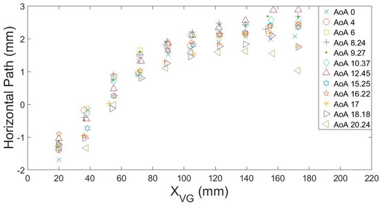 As concluded in Ibarra-Udaeta et al. [46], the vortex peak path tends to deviate laterally in the direction marked by the device. In Figure 8 the lateral displacement can be noticed, which has a similar deviation for all AoAs in steady angles and stall angles, but is less displaced at high degrees. The trend of its deviation is higher at first distances in all cases, with a decay of deviation at 80 mm from the device. At 160 mm onwards, it is possible to see how the vortices at the highest AoA tend to go back to the device zero coordinate.