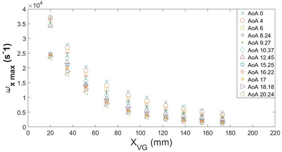 Vortex decay is a well-studied parameter that consists of the strength force loss of a vortex. In a study by Martínez-Filgueira et al. [6], the peak decay was analyzed over a flat plate. In that study, the decay development was exponential; the further it was from the device, the smaller the peak. In this study, values of the peak vorticity for every AoA in relation to the range toward VG are shown in Figure 9. It can be observed that the value varies for each angle, with different behavior between steady and stall angles in the near wake behind the VG. Higher peak vorticity values correspond to steady degrees, decreasing at higher AoAs. After the first 40 mm, the value of vorticity starts converging, with a similar value until the last 175 mm from the device, where it is less than 5000 s–1, and always lower for higher AoA.