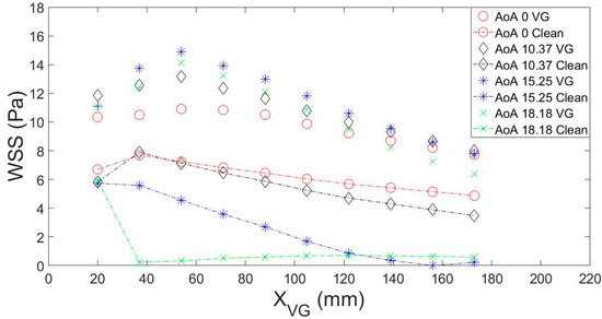 In the cases with a VG set up over the airfoil, all plots show an increasing trend up to 54 mm downstream from the leading edge of the VG device. From this point onward, the values decay gradually up to a value between 42% and 70% at the last 173 mm from the VG (at higher AoAs, the difference between maximum and minimum is smaller). A maximum wall shear stress value of 14.86 is observed with an AoA of 15.25°.