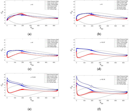 Figure 11 shows the pressure distributions on the clean DU97W300 airfoil and the airfoil with VG at 0°, 4°, 6°, 10.27°, 15.25°, and 18.18° AoA. The airfoil profile and VG are illustrated with black lines. The difference between values at the pressure side and suction side represents the capacity to generate lift. The VG implementation barely affects the Cp distribution at low AoAs between the clean and flow-controlled airfoil. However, the increment in the pressure coefficient due to VG implementation is very noticeable at high angles of attack. It is from 12° onward where the device demonstrates high performance capacity. It is noteworthy that there exists a cut value in the suction side case due to the presence of the VG.
