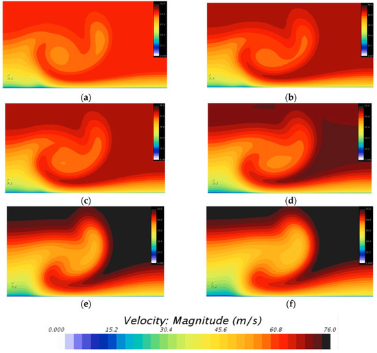 Figure 12 illustrates the axial velocity fields for a qualitative comparison between six angles, AoA = 0°, 4°, 6°, 10.37°, 15.25°, and 18.18°. These snapshots were taken at the plane position five device heights downstream of the VG. According to Urkiola et al. [47], at that position the vortex is totally developed, and this shows how the vortex shape varies with the angle of attack. As a qualitative observation, it denotes that the size of the vortex increases with the AoA. The effect of the VG device is lower at small AoAs in comparison with higher angles. This is in agreement with the results presented in Figure 11 about the pressure distribution along the airfoil.