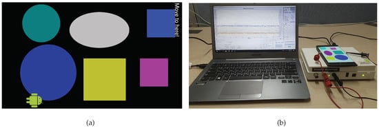 We developed a simple GUI application as shown in Figure 2a. The goal of the application is to find a specific GUI object by moving the icon object. The acceleration sensor data are used to detect this motion. One out of two colors (black or white) was used as a background color, which cannot be then used as the color of a GUI object. Six different GUI objects, each with different sizes, can be configured with up to 29 colors tabulated in Table 2.