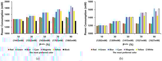 We first examined how the values of and the most preferred color affect total power consumption of an OLED smartphone when the aforementioned simple GUI application is running. The results are shown in Figure 3. The most preferred color is chosen from seven basic colors (red, green, blue, cyan, magenta, yellow, and black or white). Table 4 and Table 5 tabulate the color combinations selected for each object for different values of when white and black were selected as background colors, respectively.