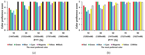 Overall color preference score as a function of values of when the background color is white (a) or black (b).