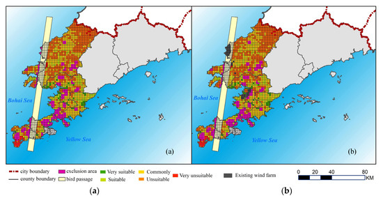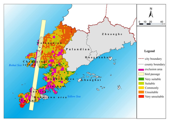Figure 4 shows the comparison situation between the evaluation results and the locations of the existing wind farms. The existing wind farms in the studied district account for 56 grids, 25 of which are located in the exclusion zone, while the remaining 31 are roughly matched with the suitable areas. Among these are eight existing wind farms in the suitable area, 18 in the general suitable area, and five in the unsuitable area. It is obvious that a large part of existing wind farms is not located in the suitable area. This is because some are located near the bird passages or petrochemical plants, with the potential risk and adverse impact on the rare birds, although these sites generally have better wind resources. For the above reasons, these areas are determined as the excluded region and are not considered in our study. It can also be seen that the existing wind farms in this region emphasize the wind power generation and the economy more, compared to ecological protection, production safety, and social impact. It may incur the opposition sourced from local residents and some departments of the ecological and environmental protection.