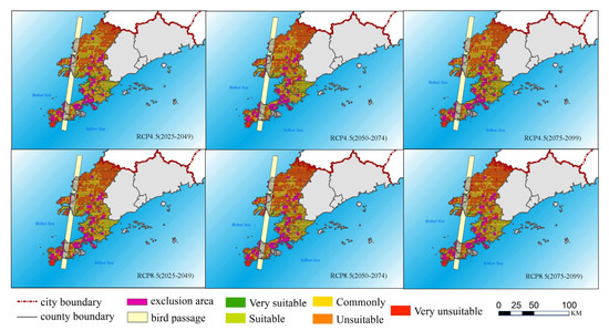 The influence caused by the change of wind speed under climate change on the site selection also is estimated, where the evaluated results under two scenarios (i.e., RCP 4.5 and RCP 8.5) over three periods (i.e., near, medium, and longer term) were shown in Figure 4. The regional climate model PRECIS developed by the British Meteorological Office Hadley is used to generate annual wind speed values over the next 75 years under two climate change scenarios due to its flexibility and applicability, where the average wind speed at three periods were considered as the evaluation indicator, i.e., near-term (2025–2049), mid-term (2050–2074), and long-term (2075–2099), respectively [23]. Finally, site-selection results under climate change were generated. As demonstrated in Figure 5, the decrease in wind speed caused by climate change exerts the adverse effects on the wind power development. The RCP8.5 scenario is less suitable for wind power development than the RCP4.5 scenario. Compared with original evaluation results, the suitable area over three periods under the RCP 4.5 scenario reduced by 5.80%, 11.61%, and 11.61%, respectively; the unsuitable area increased by 6.87%, 20.27%, and 17.70%, respectively. Correspondingly, the suitable area under the RCP 8.5 scenario reduced by 13.87%, 26.45%, and 27.01%, respectively; the unsuitable area increased by 22.68%, 40.03%, and 41.24%, respectively. This is mainly due to the fact that the reduction of wind speed would impair its advantages in many candidate sites, leading to their degradation. For example, the upper middle part of the studied region including 304 grids, without the consideration of climate change, its total magnitudes of very suitable, suitable, general suitable, unsuitable, very unsuitable grids are 37, 31, 128, 45, and 1, respectively. Under the RCP 4.5 scenario in the long term, the suitability of 27 grids dropped by one grade, where they are 13 very suitable grids, three suitable grids, 11 general suitable grids, respectively. This variation trend was more obvious under the RCP 8.5 scenario, where the number of suitability-degraded grids reached 57, including 27 very suitable sites, four suitable sites, 25 general suitable sites, and one unsuitable site. In order to better reflect the influence exerted by the variation in wind speed on site selection results, the wind speed data in the past 25 years (1995–2019) is collected and the average wind speed in this period was considered as the evaluation indicator. Figure 6 shows the suitability evaluation results under historical wind speed. It is indicated that the grade of suitability degree was enhanced compared to the evaluated results under climate change, where the suitable area has increased by 15.81% and the unsuitable area has decreased by 13.92% over the past 25 years. This is because the available wind speed under climate change dropped significantly. Therefore, the influence exerted by the climate change on the wind speed should be incorporated into the site selection process of the wind farm in order to generate the suitable wind power development project adapted to climate change, especially the location identification of some large scale wind power bases and determination of the wind turbine quantity and type. Moreover, subjected to the reduction in wind power, relevant energy authorities should adjust the layout of renewable energy generation through exploring more renewable energy forms, as possible.