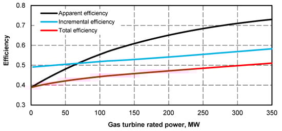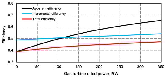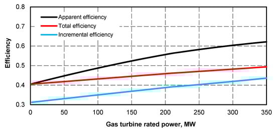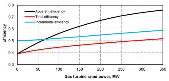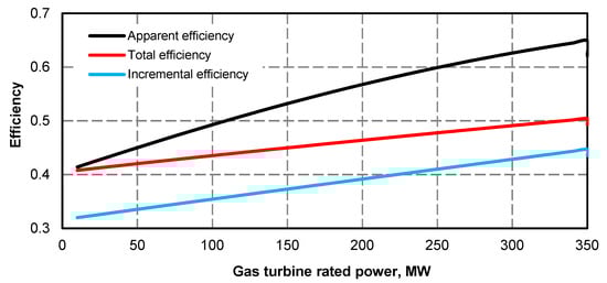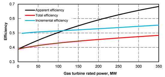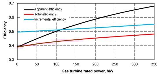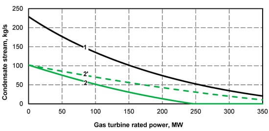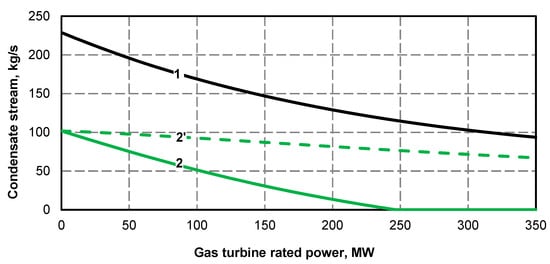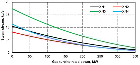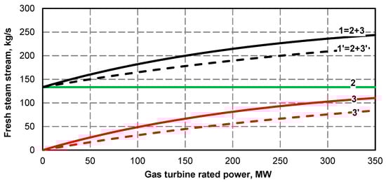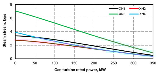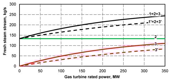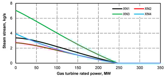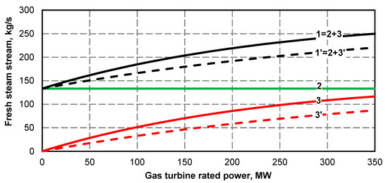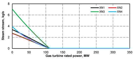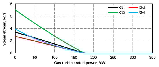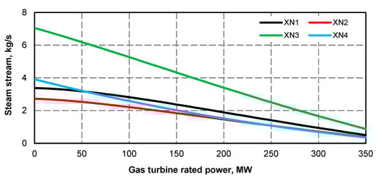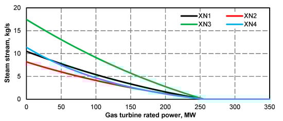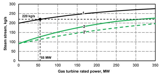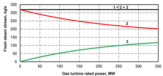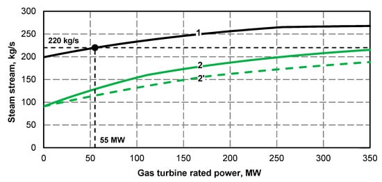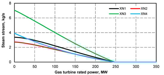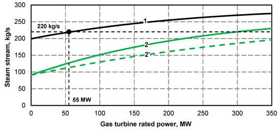 - Electric power curve for the steam turbine after adding the superstructure is compliant with its curve before the upgrade (Figure 1 and Figure 2); if at the high value of gas turbine power it was not possible to maintain the minimum power of steam turbine, the minimum efficiency of the steam boiler assumed for the calculations was 133.3 kg/s
