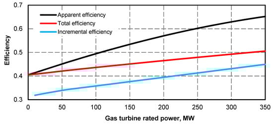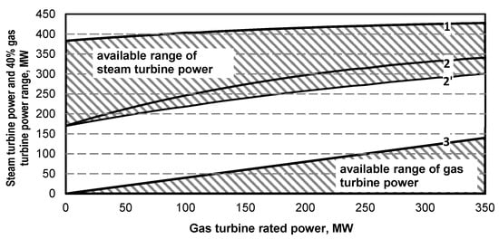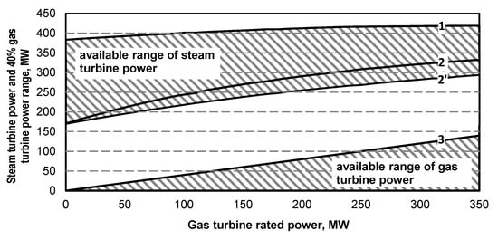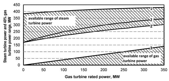 - As a result of the superstructure, depending on the power of the gas turbine and the structure of the recovery boiler, the minimum power of the steam turbine unit increases. For example, for a gas turbine power value of 350 MW, it increases to approximately 320–345 MW. Thus, it increases by about 140–165 MW over 180 MW. The increase in the maximum power of a steam turbine set is about 39–50 MW (Figure 15, Figure 27, Figure 39).