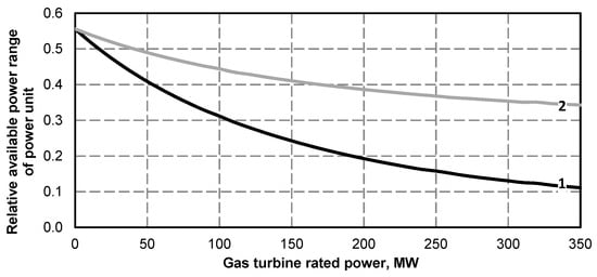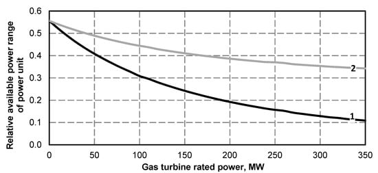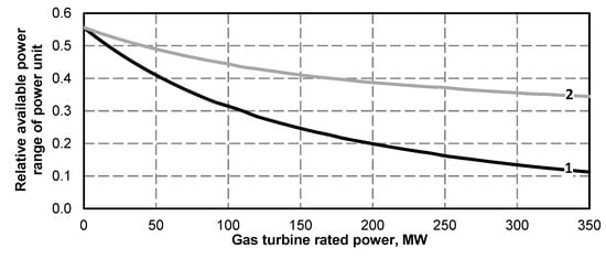- Due to a large increase in the minimum power of a steam turbine set and a small increase in its maximum power, the operating power range decreases. For operation of the superstructure of a unit with rated gas turbine capacity of 350 MW it is about 11% (Figure 16, Figure 28, Figure 40), which is a very small value.