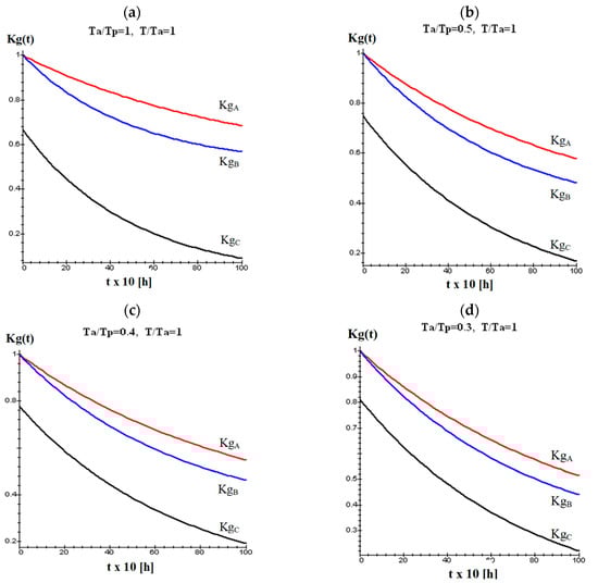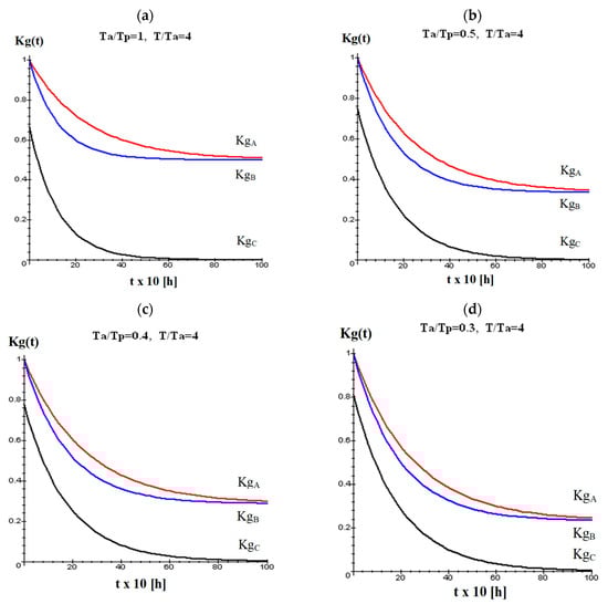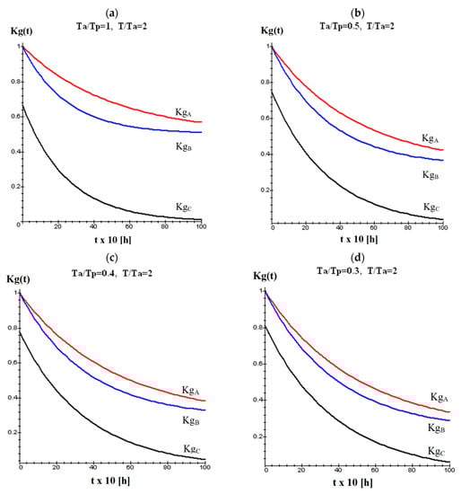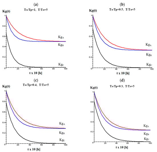 a) as presented in the form of dependences (4 and 5), the value of the quantity examined of the readiness coefficient for the individual models of the operation process (A, B and C models) increases. This conclusion seems be correct also because an increase of the duration of maintenance activities is connected with a larger—more complete scope of the preventive activities performed. A complete regeneration of the object in the maintenance system regenerates–restores the source (ability) of the object to perform its tasks. Therefore, the values of readiness function (K