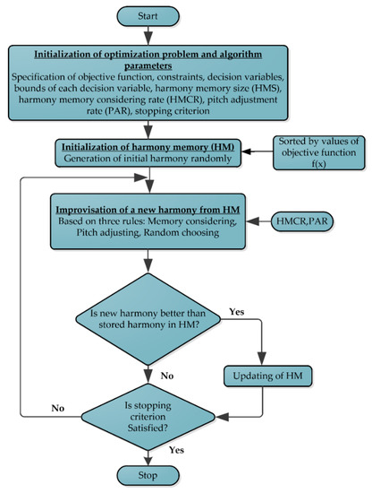 The HSA is a successful metaheuristic algorithm introduced by Geem et al. [38]. It is stimulated by the ideologies of the musicians’ improvisation process for finding the best harmony. The flowchart for HSA is represented in Figure 1.