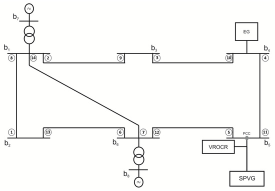 The proposed hybrid approach is implemented on a 40 MW SPVG-connected eight-bus network with a voltage rating of 150 kV. A minimum rating of 40 MW is required for SPVG if it is connected to the high voltage grid of 132 kV or above [1]. Accordingly, the 40 MW SPVG is designed, and it supplies 150 A current to the eight-bus network through bus 5, as shown in Figure 2. The data for the eight-bus network were provided in [47].