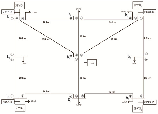 In this case, four SPVG-connected systems with nine buses (b1 to b9) are considered (Figure 4). An SPVG of 8–10 MW is required for connecting to a 30–34.5 kV grid [1]. Therefore, each SPVG is designed with ratings of 8 MW and 33 kV. These are connected as SPVG1 at b7, SPVG2 at b5, SPVG3 at b9, and SPVG4 at b3. Each SPVG supplies the current of 138 A to the network. The external grid (EG) with 400-MVA short circuit capacity is connected to b1. The impedance of each line segment is (0.0057 + j0.071) Ω/km. The current magnitude for close-in 3-Φ fault sensed by P/B pairs of DOCRs is provided in Table 6.