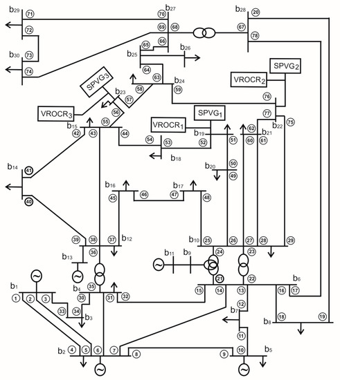 To confirm the success of the proposed hybrid approach, its performance needs to be demonstrated using a larger and more complex system. For this task, the IEEE 30-bus network is selected, as shown in Figure 5. It can be considered as a meshed sub-transmission and distribution system [10]. This complex power network has 30 buses (132 kV and 33 kV buses), 37 lines, 78 DOCRs and 3 VROCRs. In addition, three SPVGs with the rating of 8 MW are connected to the distribution network (33 kV) as SPVG1 at b19, SPVG2 at b22 and SPVG3 at b23. As it includes VROCRs, the total number of constraints increased to 666 as compared to 426 when considering only DOCRs in the test system. Thus, optimization methods have to consider highly constrained optimization problems in this test case.